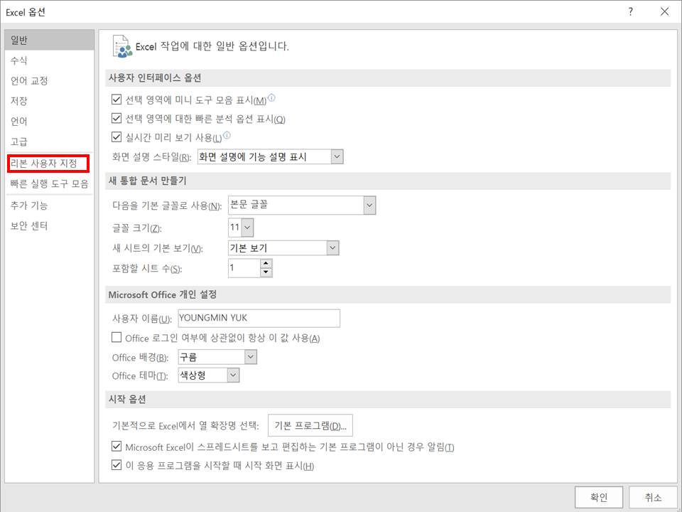 STEP4. 리본 사용자 지정 선택( 클릭 )